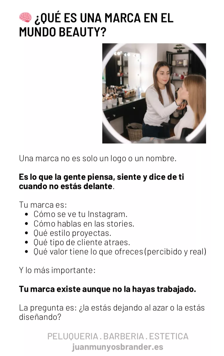 Dirigido a peluqueras y peluqueros, barberos y barberas, maquilladoras/es y esteticistas. Este eBook tiene como objetivo yudar a profesionales y negocios del sector beauty a crear una marca sólida en redes y fuera de ellas, que transmita valor, suba precios, atraiga al cliente ideal y deje de competir por precio.
